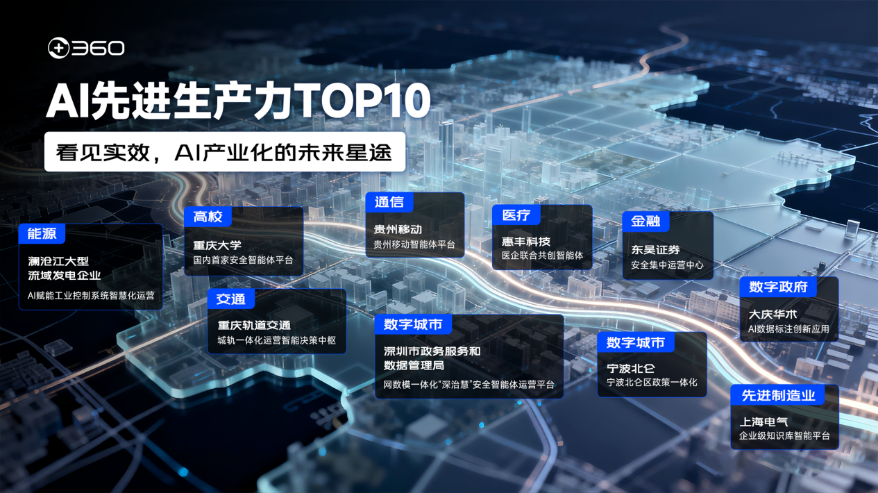IDC预计,到2030年,AI将在全球创造22.3万亿美元的总价值,这将占到全球GDP的3.7%。但其价值的真正释放将是渐进的,这是一场长坡厚雪的产业演进。 面对这一趋势,作为国内较早布局人工智能且兼具深厚安全基因的科技企业,360集团于2025年明确“AllinAgent”战略——聚焦打造能深度融入特定业务流程、切实解决产业痛点的“智能体”。基于此,360构建起L1—L4多智能体蜂群体系,打通AI应用全链路,让技术真正扎根产业腹地。 近期发布的“AI先进生产力TOP10”案例,正是这一战略落地的集中检验。这些覆盖十大关键行业的实践,以一系列可验证的效能数据,为AI如何赋能产业价值提供了实效样本。