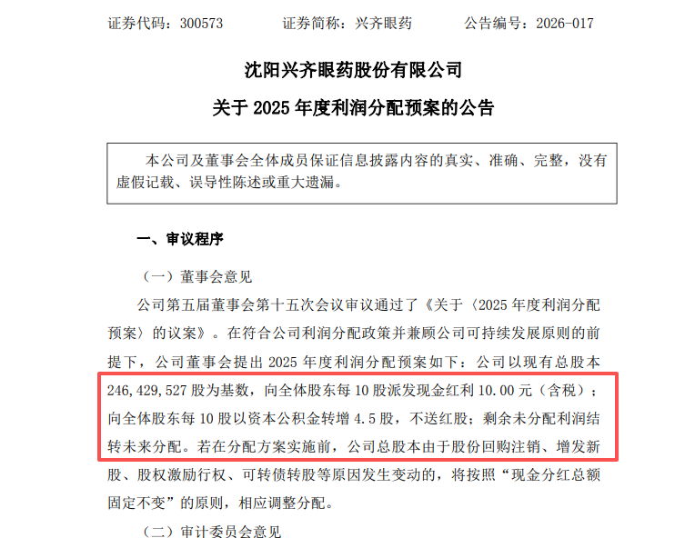 “利润增速远高于收入增速,是公司产品结构优化、产能与管理升级的结果,核心因素在于高毛利主力产品放量带来的产品结构优化和规模效应显现,以及成本、费用管控带来的盈利能力显著增强。”深圳市优品投资顾问有限公司李鹏岩向《证券日报》记者表示。 作为一家专注于眼科药物研发、生产与销售的高新技术企业,兴齐眼药已构建覆盖近视防控、干眼治疗、抗感染等十余个细分领域的全品类眼科用药体系,核心产品竞争力突出。其中,延缓儿童近视进展的硫酸阿托品滴眼液形成阶梯浓度产品矩阵,环孢素滴眼液(Ⅱ)获评辽宁省科技进步奖二等奖,多款产品入选医保目录与单项冠军产品,构筑起强劲的产品护城河。截至4月21日收盘,兴齐眼药总市值超160亿元。 年报显示,在硫酸阿托品滴眼液、环孢素滴眼液等核心品种的持续放量带动下,兴齐眼药滴眼剂板块快速增长。2025年度,兴齐眼药滴眼剂板块实现收入19.50亿元,同比大增42.76%。同时,该板块毛利率也同比提升2.94个百分点,达到85.12%。量、利齐增的滴眼剂板块已成为兴齐眼药最重要的利润来源。 收入端快速增长的同时,在费用端,兴齐眼药2025年度销售费用率同比下降5.41个百分点,达到30.89%;管理费用率同比下降1.70个百分点,进一步优化到7.06%。 “销售费用率的明显下降,显示出核心品种的品牌认知度提升后,市场推广的边际效率正在改善,同时叠加管理费用率的优化,也进一步增厚了利润。”有不愿具名的市场人士向《证券日报》记者表示。 自创立以来,兴齐眼药始终重视新产品的研发,并将开发具有自主知识产权的新产品作为公司持续进步和创新的目标,加快推进研发管线的全面化、差异化布局。年报显示,2025年,兴齐眼药研发投入2.46亿元,连续多年研发占比维持在较高水平,构建起了从近视防控、干眼治疗到眼底疾病、抗感染等全覆盖的研发矩阵,多款在研创新药进入临床阶段。其中首个大分子生物创新药SQ-22031、眼底缓释注射液SQ-129等重磅品种进展顺利。 李鹏岩认为,丰富的研发管线不仅为兴齐眼药积累了充足的新品储备,也将为公司的中长期增长带来持续动力,打开更广阔空间。 值得关注的是,继2025年半年度每10股派发现金红利7元后,2025年期末,兴齐眼药再度大手笔回馈投资者。据公司同步披露的利润分配预案,兴齐眼药拟向全体股东每10股派发现金红利10元(含税),每10股以资本公积金转增4.5股。算上此次分红,自2016年上市以来,兴齐眼药现金分红已15次,累计分红14.13亿元,派息融资比高达201.02%。 “持续研发投入构筑深厚技术壁垒,创新管线不断落地兑现业绩,进而支撑稳定高分红,形成可持续发展闭环。”李鹏岩表示,兴齐眼药持续高比例分红回馈投资者,不仅彰显了公司的经营底气以及对股东的回报诚意,也意味着兴齐眼药已经走出了一条创新发展与回报平衡的高质量发展路径。 (编辑 上官梦露)
