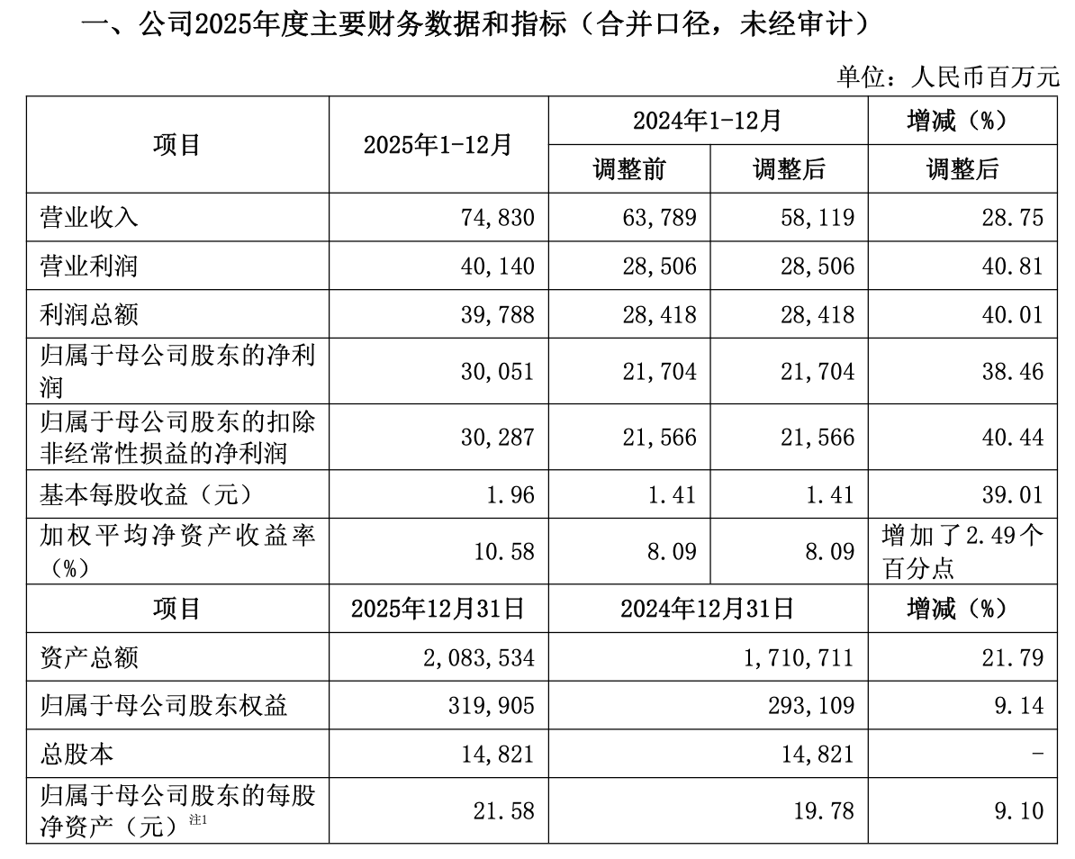 本报记者 周尚伃 1月14日晚间,证券行业龙头中信证券正式披露2025年业绩快报,这也是上市券商阵营中首份2025年业绩快报。 快报“成绩单”显示,中信证券积极融入经济社会发展全局,始终胸怀“国之大者”,主动服务国家重大战略,加快一流投资银行和投资机构建设,做深做实做精金融“五篇大文章”,经营业绩保持增长,各项业务稳健发展。 具体来看,2025年,中信证券实现营业收入748.3亿元,同比增长28.75%;实现归属于母公司股东的净利润300.51亿元,同比增长38.46%。实现基本每股收益1.96元,同比增长39.01%;加权平均净资产收益率10.58%。 资本实力是券商拓宽业务边界、抵御市场风险的核心基石。2025年,中信证券持续加码资本补充与优化配置,资本优势进一步夯实。截至2025年12月31日,中信证券资产总额为20835.34亿元,同比增长21.79%。雄厚的资本储备不仅强化了公司应对市场波动的风险抵御能力,更为经纪、资管、投行、衍生品等多元业务的协同发展提供了充足弹药。